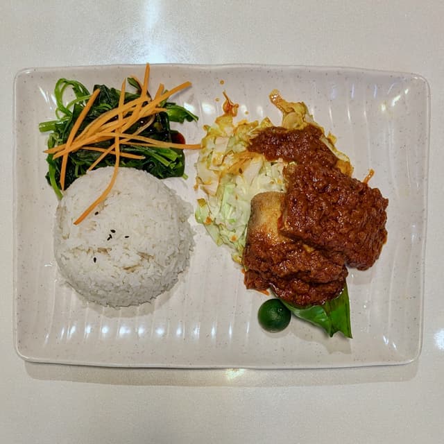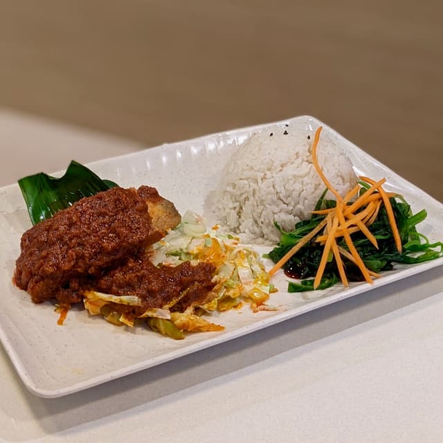 One of their signature items! Baked 'fish' on a bed of raw shredded cabbage, drenched in sambal sauce which was nice albeit oily. 🌶️ Tasty like what previous reviewers mentioned, though of note, it was the typical textured soy protein mock 'fish' and nothing exceptional to shout about. Appreciated the amount of veggies - apart from the raw cabbage, this set also came served with spinach in vegetarian oyster sauce. 🥬 I was here an hour before closing and they had run out of fragrant oil rice, so mine came with plain white rice instead. (Allium-free, $7.50) #sgvegan #chinesefood #alliumfree