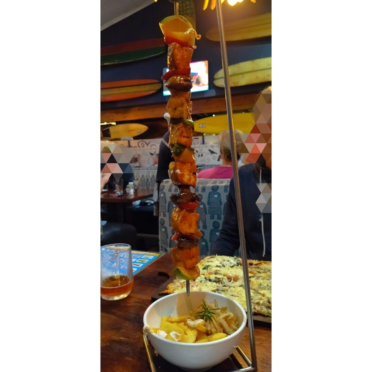 Great big chunks of tofu skewered with whole mushrooms and red and yellow capsicum (hung over the chips and onion rings side, which faded into insignificance next to that beast of a skewer 😎)