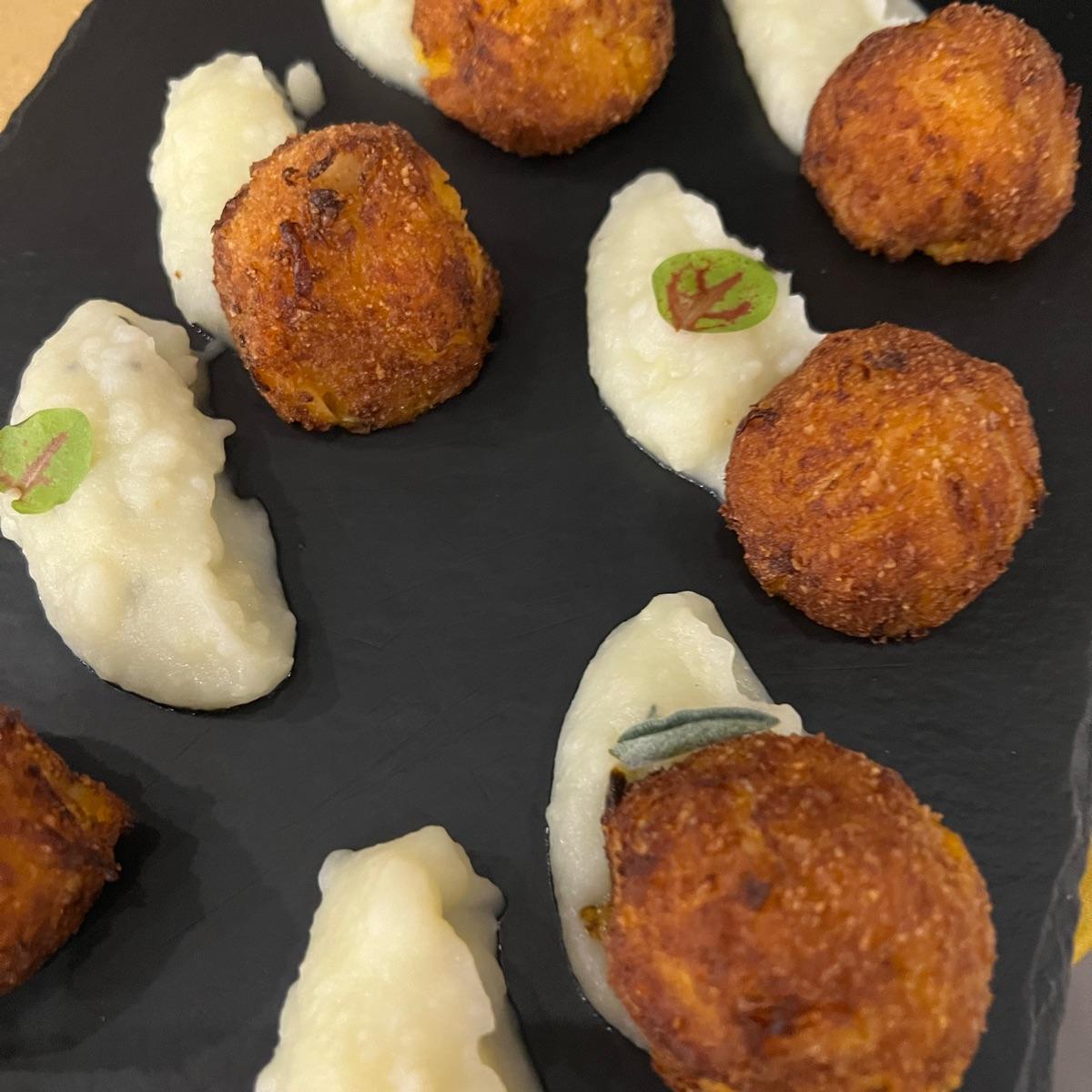Buonissime polpettine di zucca accompagnate da pure’: antipasto vegano da Mosso