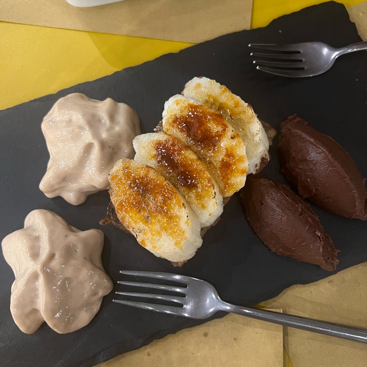 Che bello trovare anche un dolce vegano in menu! Questo era golosissimo: banana bread con cioccolato e crema alla banana