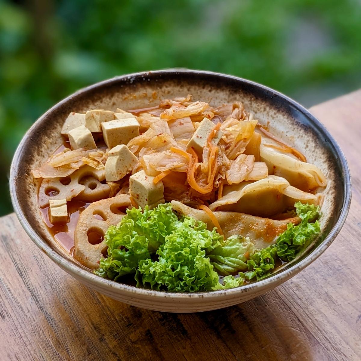 Flavourful soup featuring housemade (!!) cabbage and carrot kimchi, which was spicy, sour, and packed a punch despite not containing alliums! 🥬🥕🌶️ Always impressed by The Plant Food's effort in making food with love from scratch, as well as dedication in catering to both the vegan and allium-free crowd. 🥹 Served with chubby and chewy Japanese nama udon noodles, dumplings stuffed with assorted diced vegetables, marinated tofu cubes, lotus root slices, and lettuce. 🍜🥟 Interesting Japanese-Korean fusion soup noodles! I personally found it more flavourful than the Miso Udon Soup Noodles in the regular menu too hehe. Lunar New Year 2024 special~ 🧧 P.S. Think it would be cute to have Japanese soup noodles with OnlyEg 'ramen egg' as a new menu item ahaha am I asking for too much?? 🙈 (Allium-free, $12.90) #sgvegan #womenowned #koreanfood #noodles #alliumfree #vegancny #cny #chinesenewyear