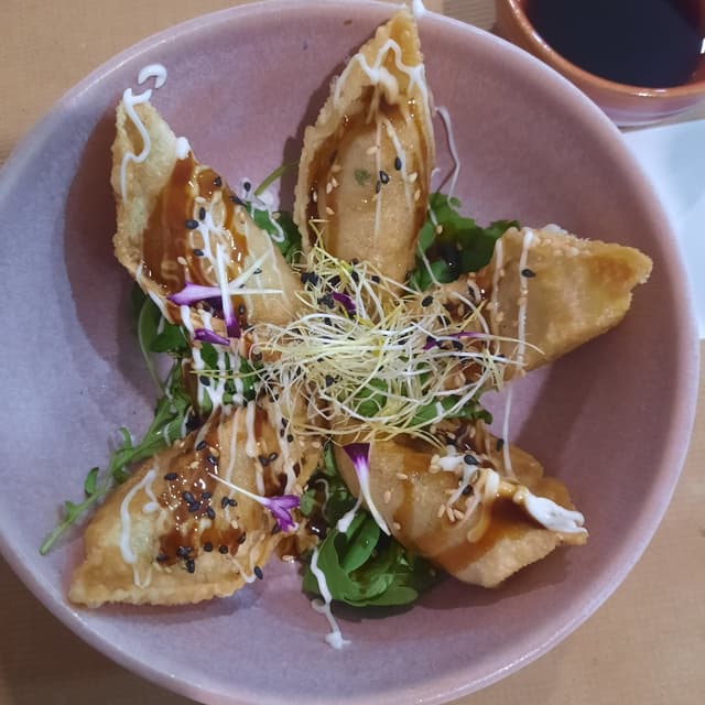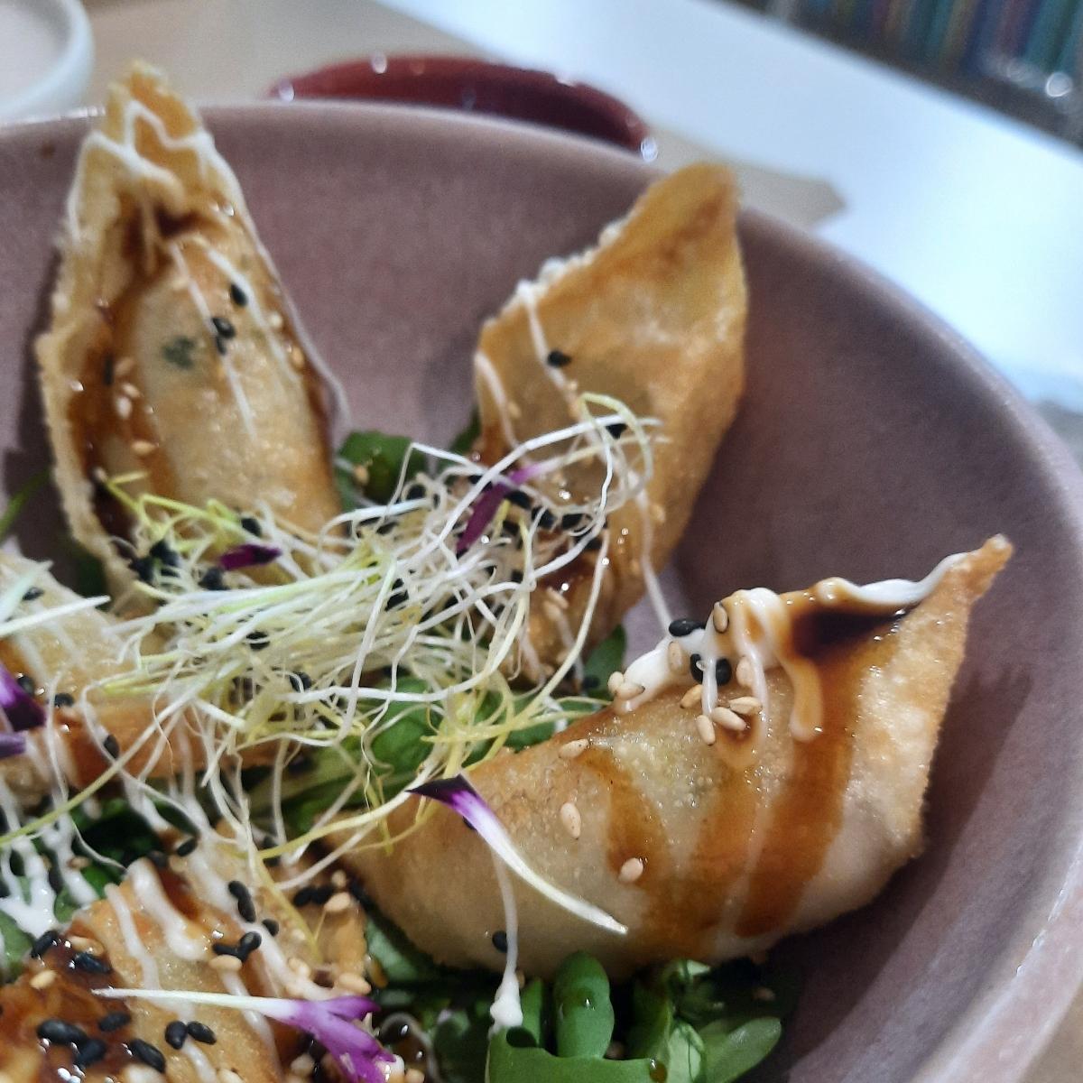 Estas #gyozas estaban muy buenas, y además les dieron el toque especial al emplatarlas con brotes y diferentes salsas.