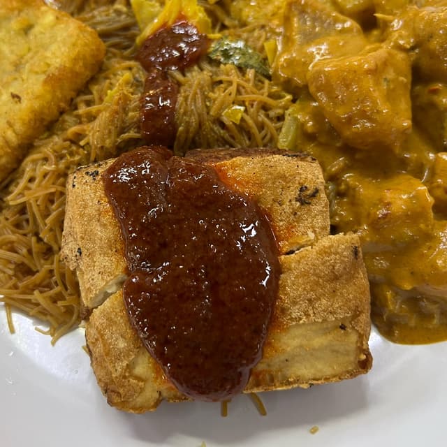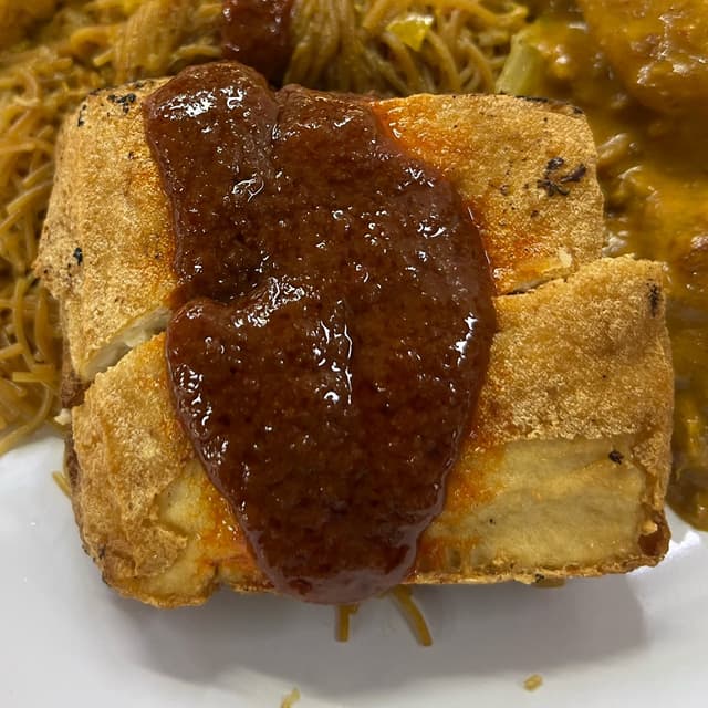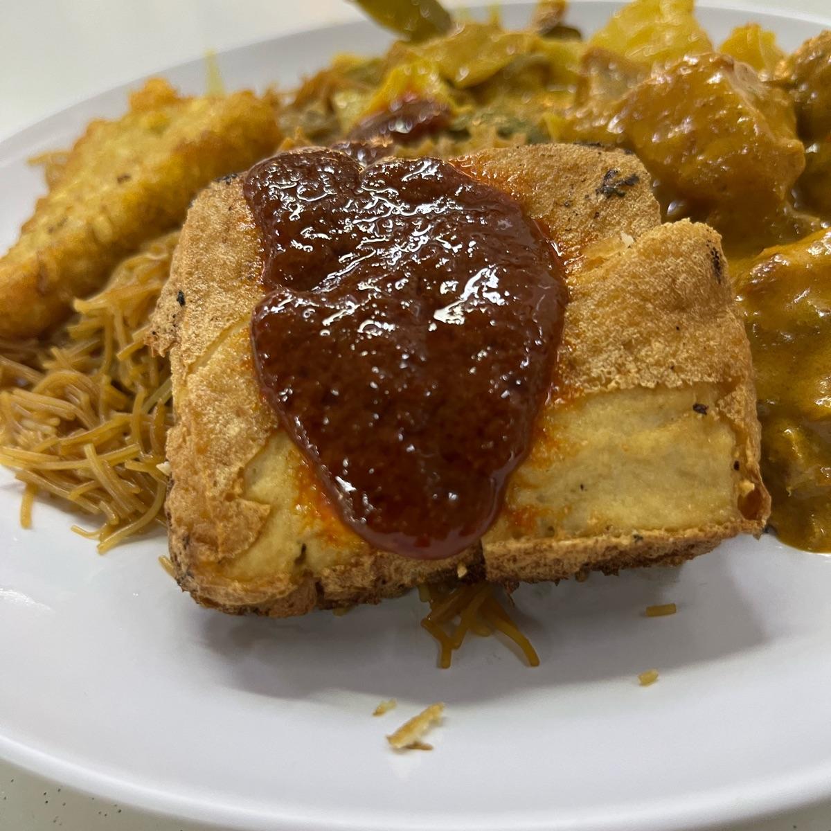Deep fried and slathered with a nice scoop of sambal. Yummers 😈 #economicalbeehoon #tofu #taukwa #heartland #kopitiamvegan #kopitiam #hougang #sambal