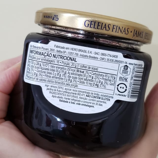 âđ± Ingredientes: amora (50%), açĂșcar, suco concentrado de limĂŁo, estabilizante pectina de fruta e antiespumante INS 471.