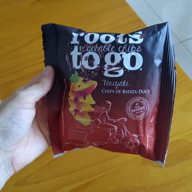 Produto vegano que apoia o produtor rural. Batata doce, óleo vegetal e aroma natural de molho teriyaki. Amei o sabor e crocância, além do tamanho da embalagem, na medida certa pra uma porção individual.