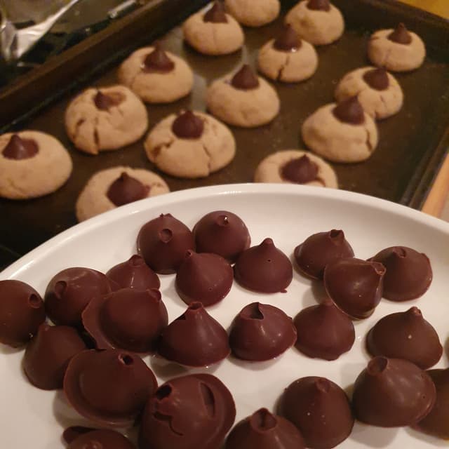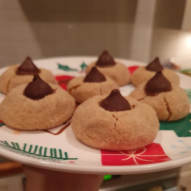 My grandma used to make these over the holidays and I was excited to find a vegan recipe for them. I made my own chocolate kisses from a mold and pressed them into homemade PB cookies.