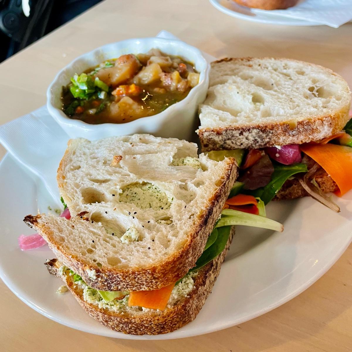 Very cute little spot. This delightful sourdough sammy was stacked with fresh veggies: House smoked hickory carrots 🥕 pickled onions 🧅 dill + lemon cashew cheeze 🍋 fresh greens 🍃 on super soft and fresh sourdough bread 🍞 The flavour didn’t remind me at all of lox and didn’t taste smoky, more of a pickle vibe, which I don’t mind one bit. The soup du jour was vegan (plantain) and was also lovely. Now we just need some vegan treats and I can move right in here