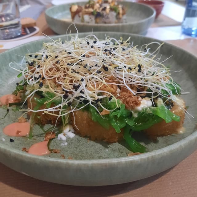 Todos los platos de #sushi de la carta pueden pedirse tempurizados, por lo que nos decantamos por esta opción. Relleno con tofu y #mango, cubierto de una generosa capa de wakame y brotes. Menuda experiencia, como todos los platos en este local. También tenéis que ver la decoración, única y divertida. #vegansushi #sushilover #asiafusionsushi