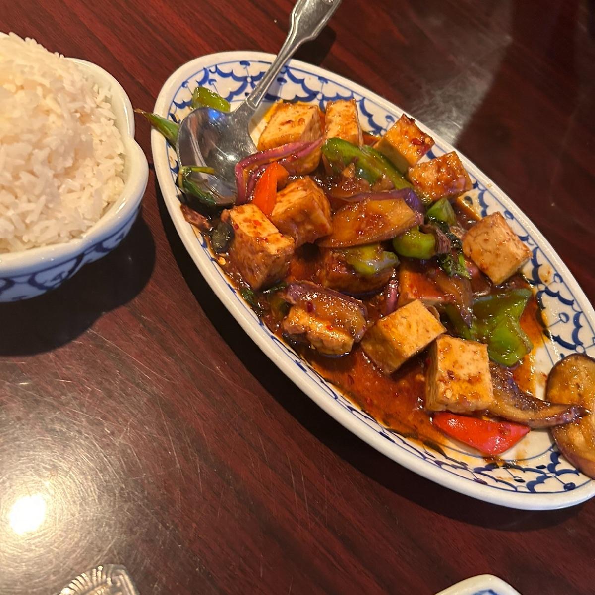 this eggplant tofu is sooo yummy, with an incredibly flavorful sauce and nice tender eggplant! paired with the rice makes it even better! i always get two star because i’m afraid of it being too spicy lolol