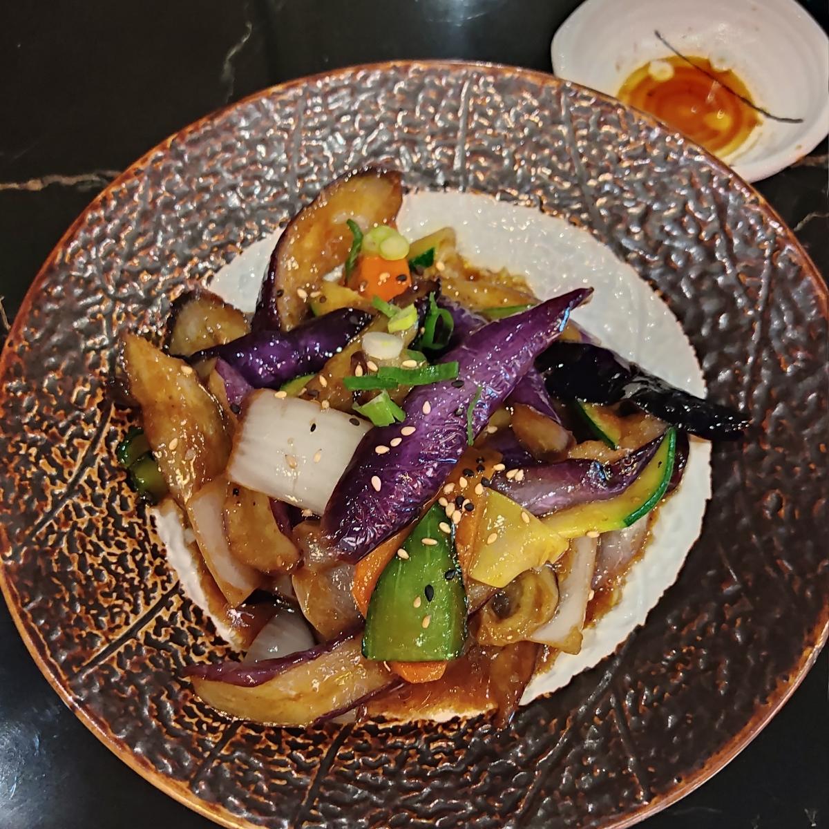 Piatto di melanzane saltate con altre verdure, carote, zucchine ed altro che non ricordo con una salsina molto buona