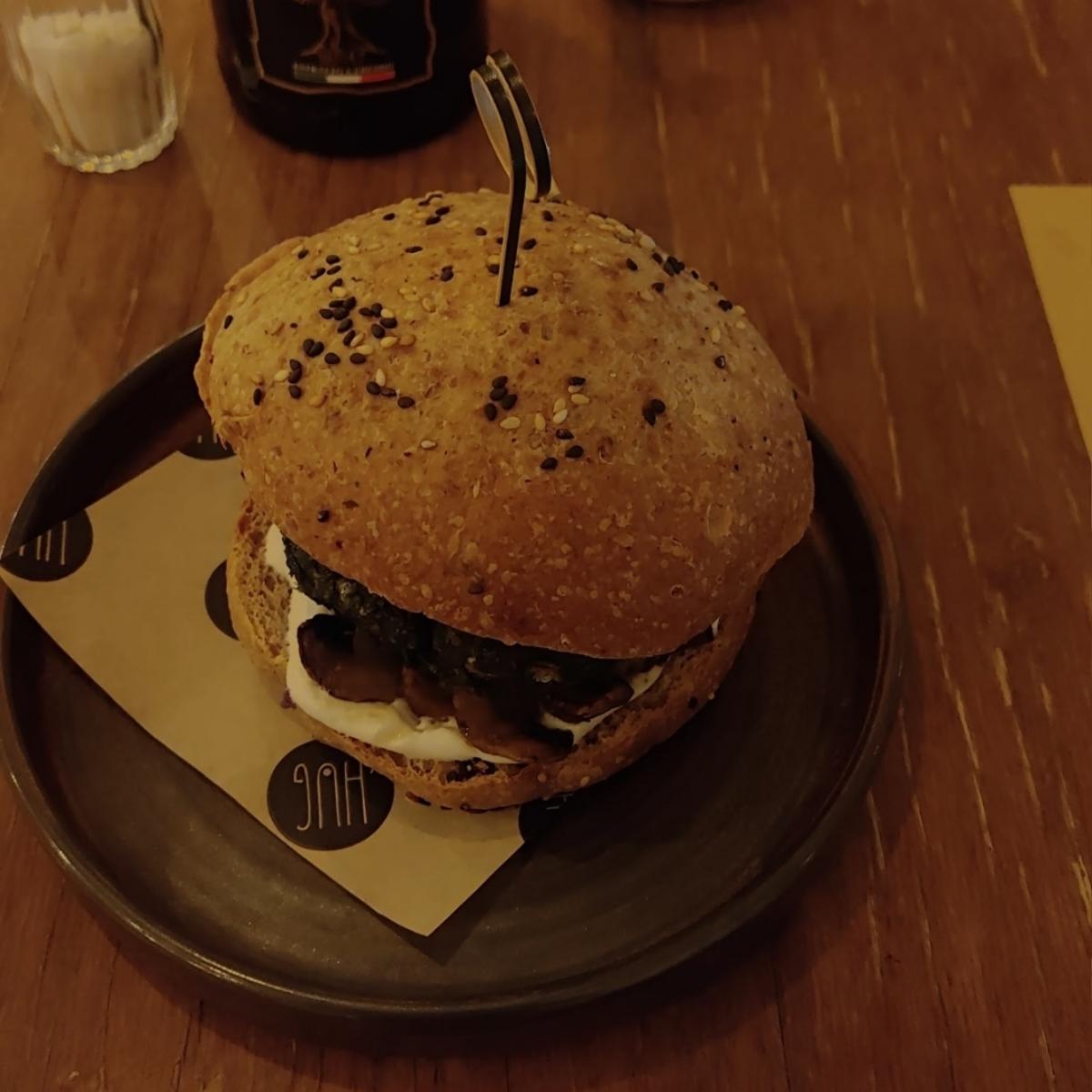 Burger di quinoa, fagioli di spagna ed erbe spontanee, salsa di noci, pinoli, trifolata di fungo Portobello, buonissima, Mayo al pino mugo, formaggio veg ai mirtilli, spettacolare