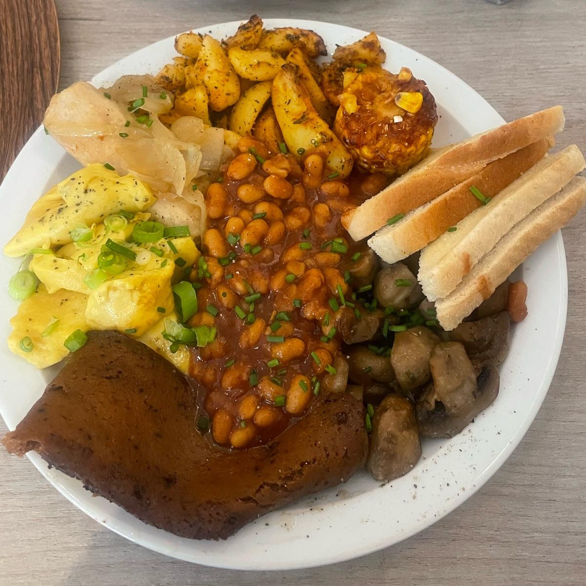 Decadent and voluptuous English Breakfast: beans, toast, “eggy” tofu, plant based bacon and sausage, potatoes and mushrooms. Worth the price (18 euros), completely cured my hungover.