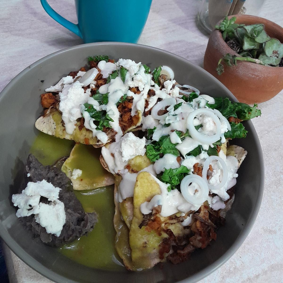 Familia vegana bonita, si eres como yo, que siempre tengo antojó de chilaquiles 🤪 en Mora Mora puedes comerlos sin culpa porque los totopos horneados y puedes escoger la salsa entre morita o verde, los acompañan con carnita de setas y cremita de nuez de la India y queso de almendras, no pueden faltar la porción de frijolitos refritos, están de rechupete 😁🤤😉 si vas a probarlos cuéntame que te parecieron.