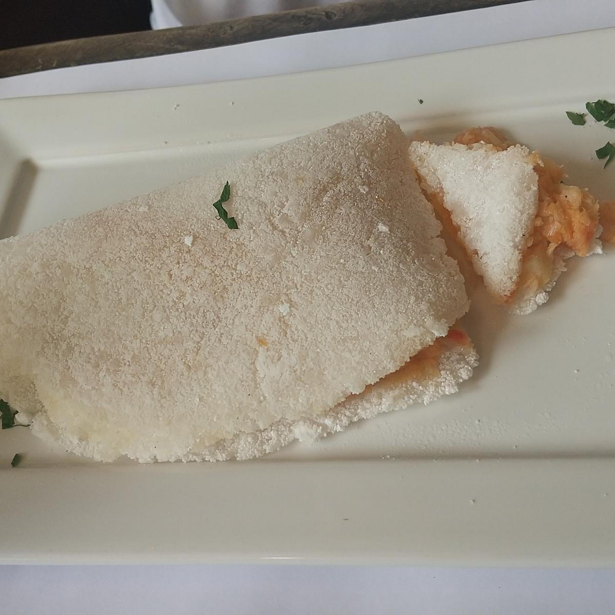 Tapioca recheada com creme de palmito e tomate. Gostoso.