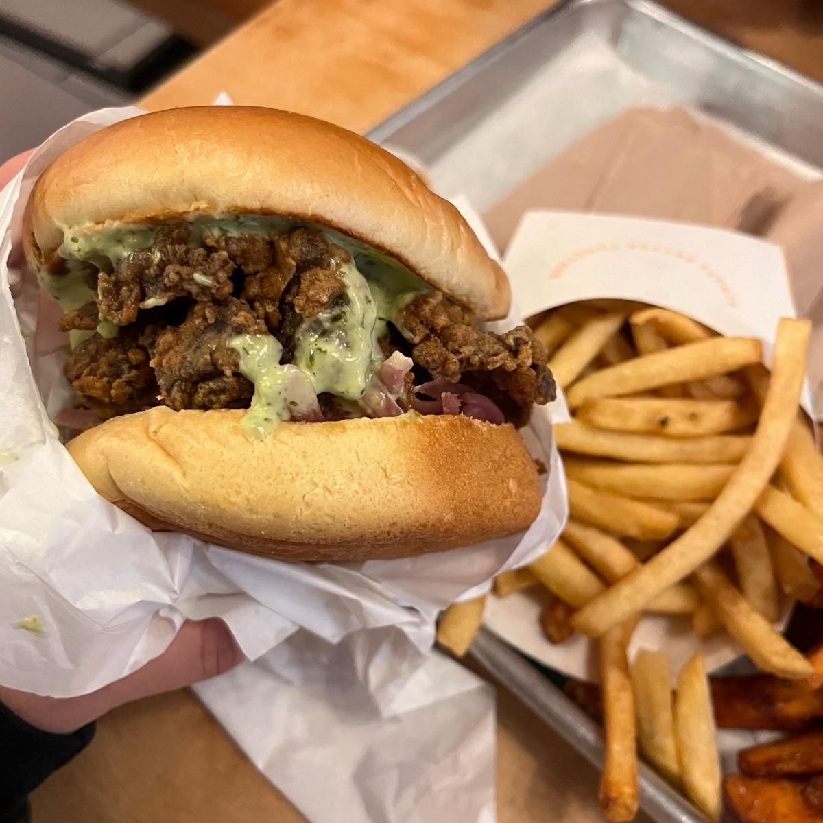 Nice! I loved the big grilled mushroom! It was crispy on the outside—a bit too crispy for me but still great. It had pickled onions which paired well. The bun was soft but did not get soggy. I had it with fries and their hipcity sauce. It was a satisfying burger :)