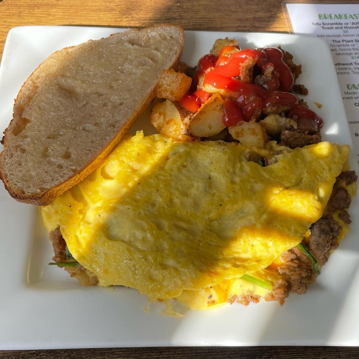 Made with Just Egg, was spot on taste, have not had omelets in a while since vegan, give it try won’t be disappointed