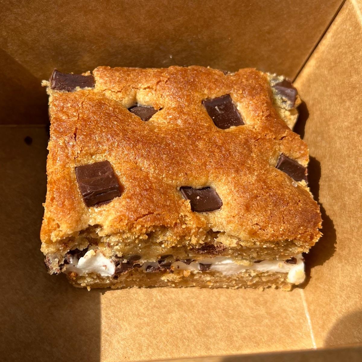 i loved this s’mores bar! the cookie layer on top and bottom brought the perfect ratio of cookie to marshmallow to chocolate! the cookie itself had a moist but not dense chocolate chip cookie flavor; the chocolate chunks were evenly dispersed throughout the bar and they were delicious! i was very satisfied with the marshmallows. while i’m not a huge marshmallow fan, these didn’t stick to my mouth or become overly chewy. they were not stale either.