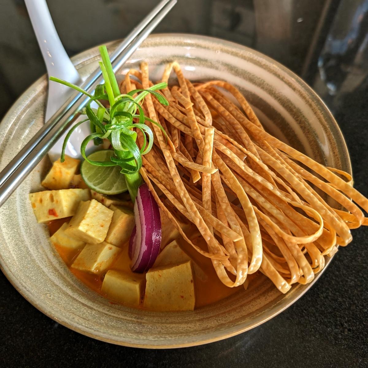 Another day, another #khaosoi ☺️ This thing is amazing, it's super creamy (on account of the #coconutmilk), but also lightly tangy and #spicy. The best part is the half-serving of #crispynoodles that is placed atop the whole thing to slowly and unevenly soften up, what pure joy 🤤 This one comes with a healthy dose of #tofu and some raw #onion, as well as the half-serving of noodles that's actually cooked 😅 Not at all a stretch of the imagination to say that I come to Thailand just to eat this as much as I can