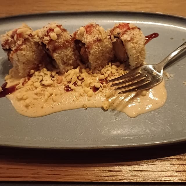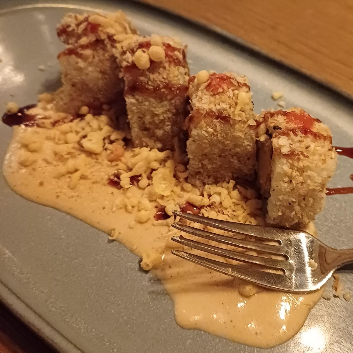 Ha una bella panatura, dei simpatici elementi crispy che non so di cosa fossero fatti e l'accompagnamento molto azzeccato di salsa al sesamo home made. Niente male!!