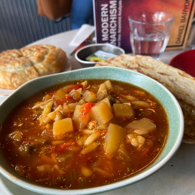 On this occasion, the soup of the day was tomato-based with mixed vegetables and pasta. It was really yummy, filled me up well, and i’m sure it’s not too bad for me either, with a healthy amount of veggies. I particulalry loved the chunks of courgettes in the soup, they were a treat. I liked bits of #celery as well. And little pieces of pasta (#gluten). Served with a couple slices of toasted sourdough whichwere also really tasty and an absolute winner. Best ask them about allergens, given the soup changes regularly. #soup #souplover #minestrone #soupoftheday #soupdogg #soupercalifragilisticexpialidocious