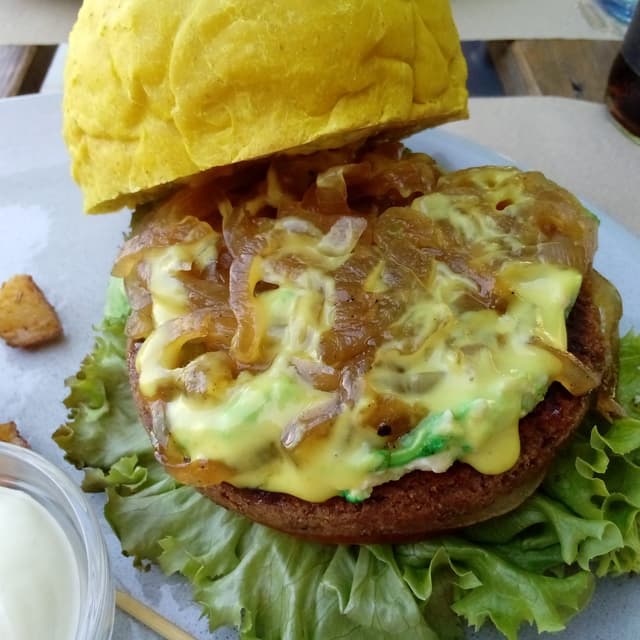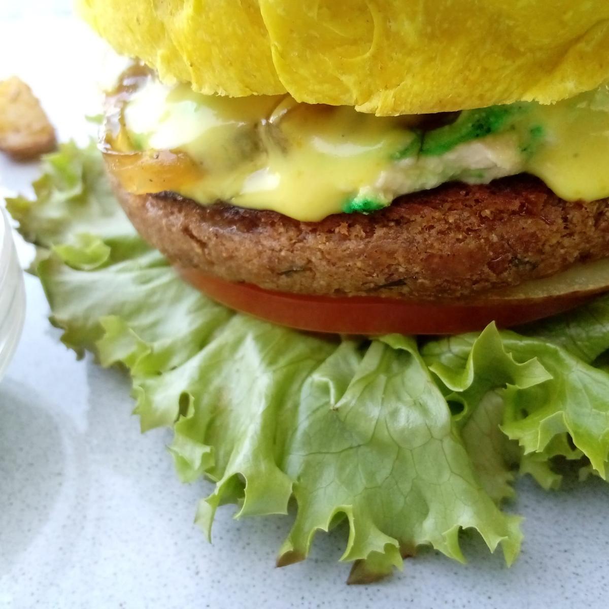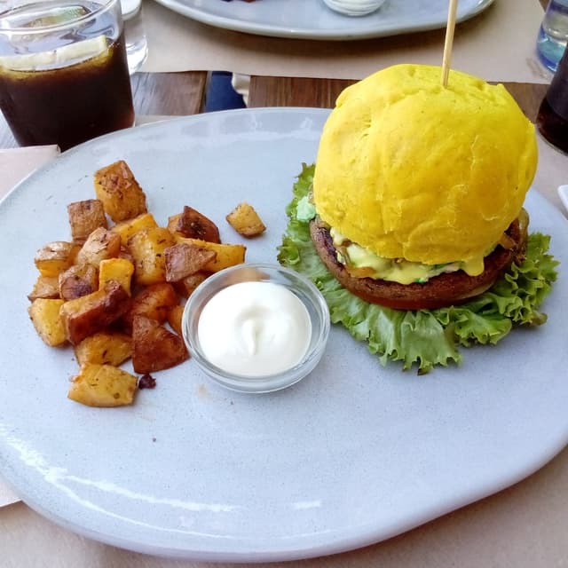 Hamburguesa de lentejas con pan amarillo (de ahí su nombre yellow), queso verde (espirulina), cebolla caramelizada, mostaza o salsa similar, lechuga y tomate. Acompañada de papas al horno.