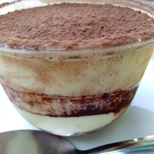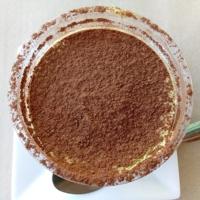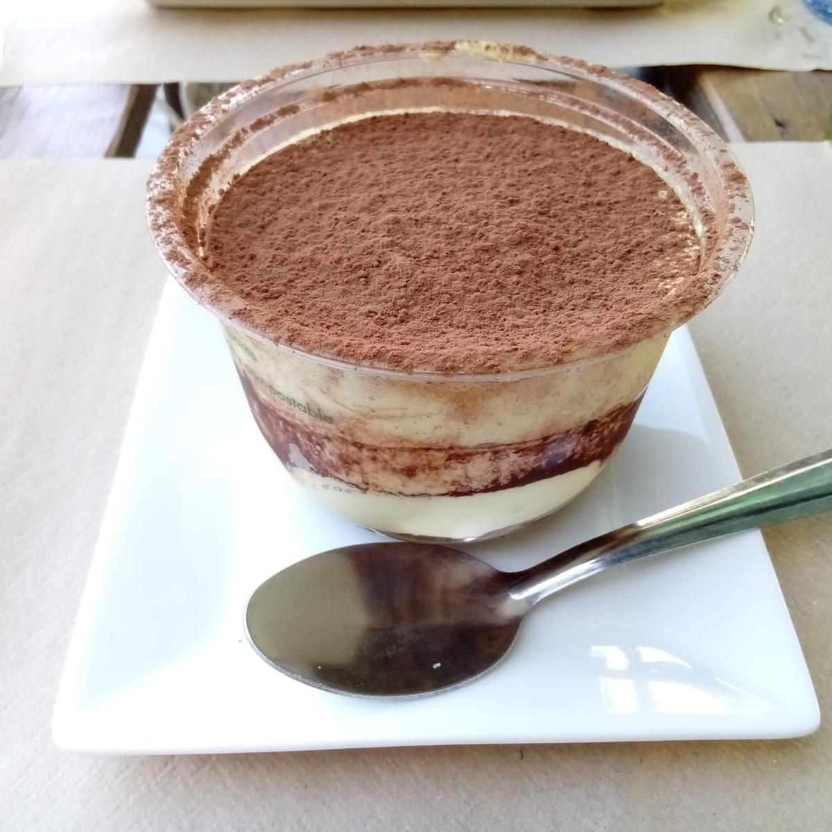 Postres tiramisú en envase compostable. Espolvoreado con cacao en polvo sobre una serie de capas que combinan bizcocho, chocolate cremoso y nata. Siempre me ha encantado el tiramisú de Buena Vida, de hecho trato de no comer demasiado para no llenarme mucho y poder pedirlo. Es todo un placer dulce.