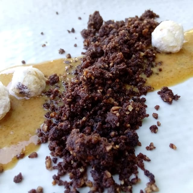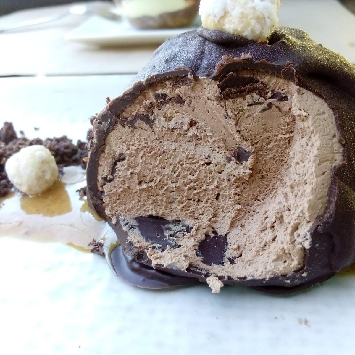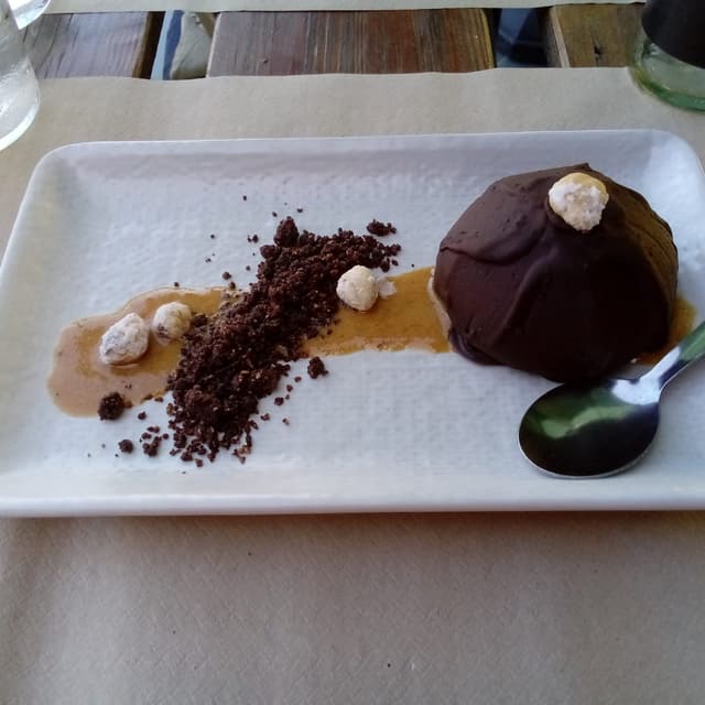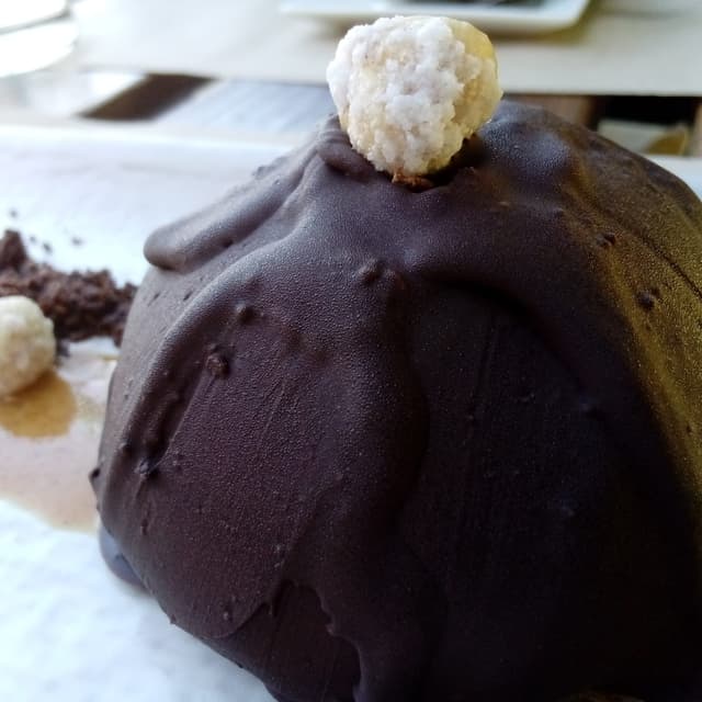 Es una media bomba de crema de chocolate recubierto de una capa de chocolate sólido; que por cierto, el chocolate es muy bueno. Además en la presentación se añaden avellanas glaseadas y trozos de choco crujiente riquísimo.