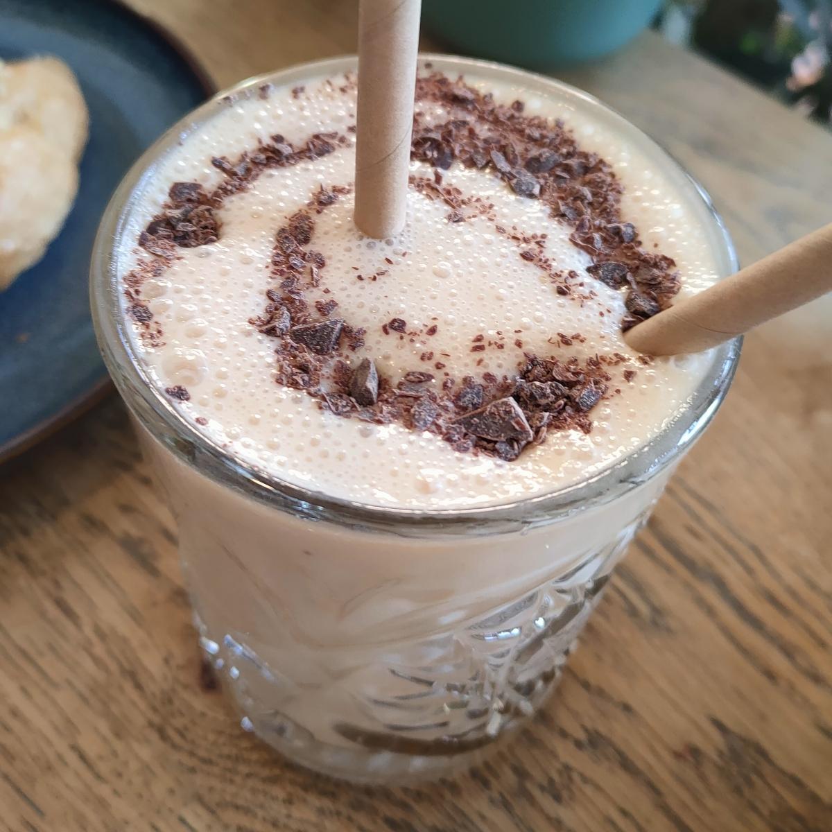 Smoothies con Banana, burro di arachidi, latte di avena e scaglie di cioccolato fondente, abbiamo potuto cambiare il latte, fatto al momento fresco e buono