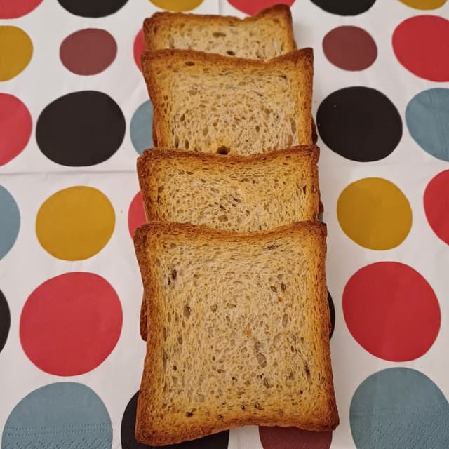 Fette biscottate (parecchio biscottate) di formato grande: chi ama pucciarle el caffè o nel latte a colazione deve spezzarle col coltello.