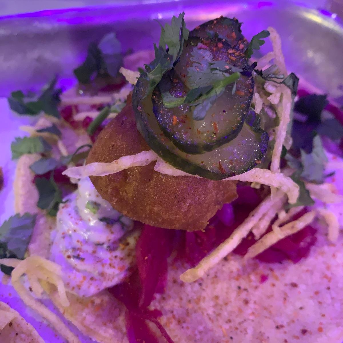 This could be my favourite, even though I loved all of them. It was packed with flavour and really authentic. It had beer battered to-fish, tiny fries, pickled cabbage, tartare sauce, avocado-mint salsa, gherkin.
