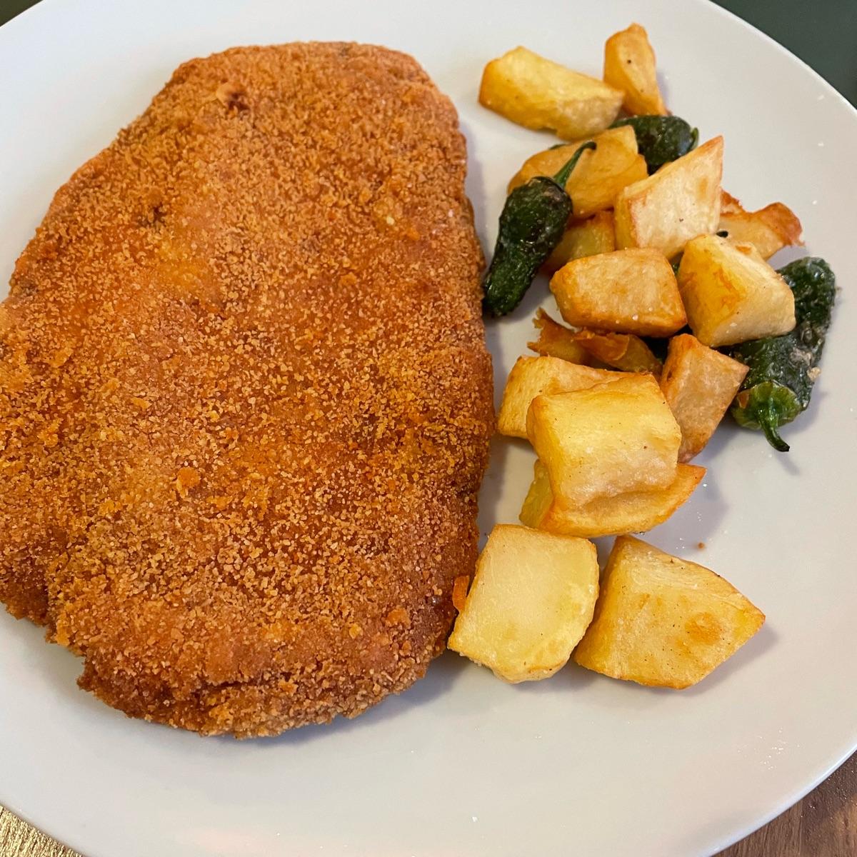 Cachopo asturiano de 350g, carne vegetal “L’Otra” a base guisantes, trigo y remolacha, relleno de Sinjamón y queso vegano azul y ahumado, con pimientos y patatas