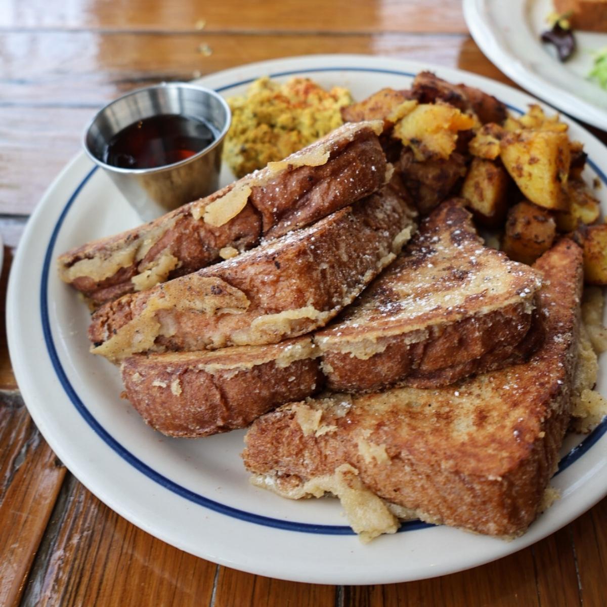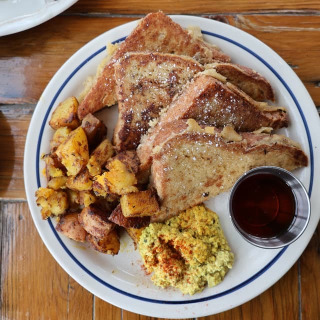 Sometimes, just a good old plain French Toast hits the spot. I was really craving these thick cut French toast pieces this morning. Last time I had their seasonal pumpkin butter and strawberry, but I think I just like plain with #maplesyrup is the best. This Happy Little Treats brioche bread is so thick and fluffy and it reminds me a lot of the French Toast I had at Modern Love Brooklyn two years ago. This is also served with a delicious #tofu scramble and seasoned home fries. The potatoes were excellent today! They were crispy, buttery and seasoned to perfection. One plate was about $15, but it was huge.