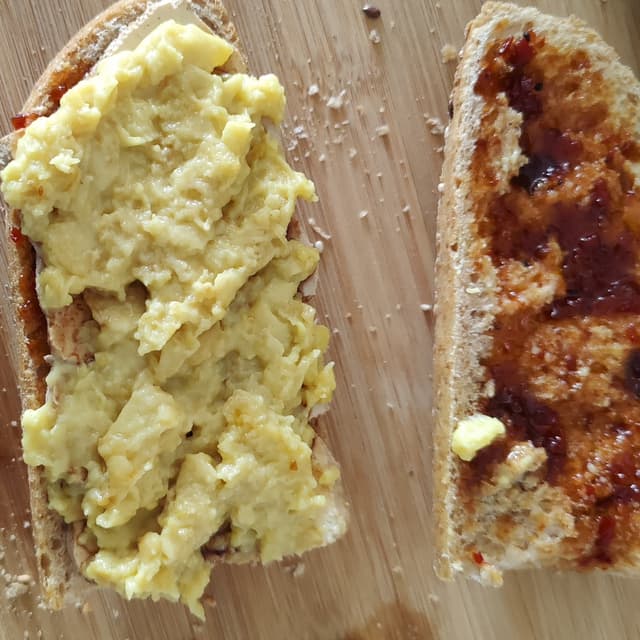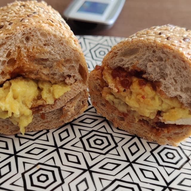 Wouldn't fool anyone non vegan into believing it's an actual egg, but for what it is, it tastes quite good. I put it in a bread with some chilli jam and smoked tofu 😋
