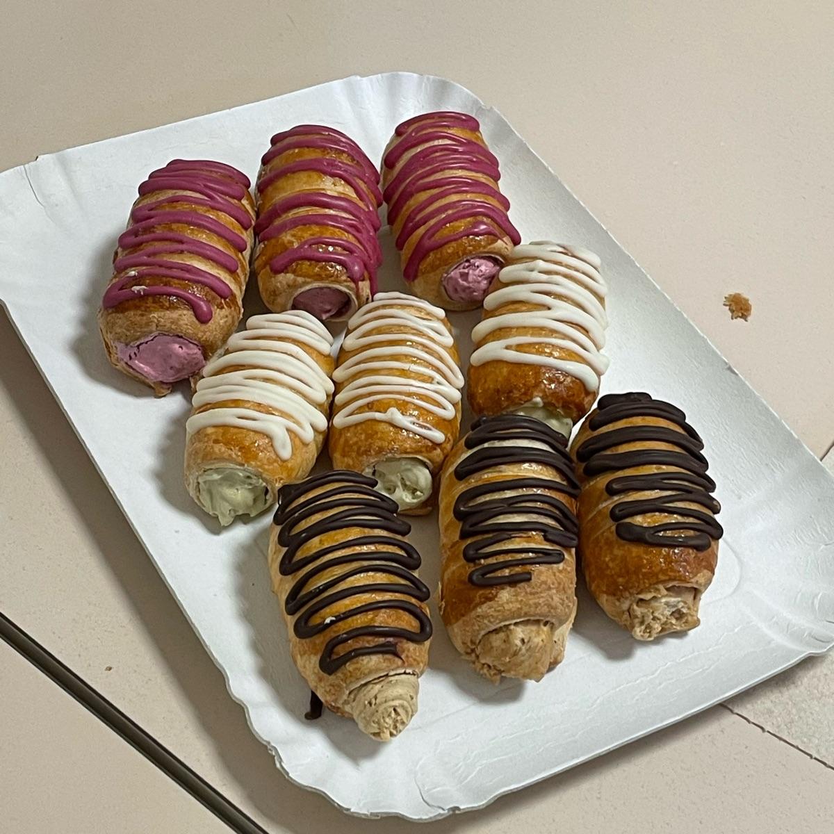 Li ha portati una mia collega al lavoro per noi 3 vegani. Sono dei cannoncini ripieni con crema al lampone, al pistacchio e al burro di arachidi.Spaziali 🥹🥹🥹