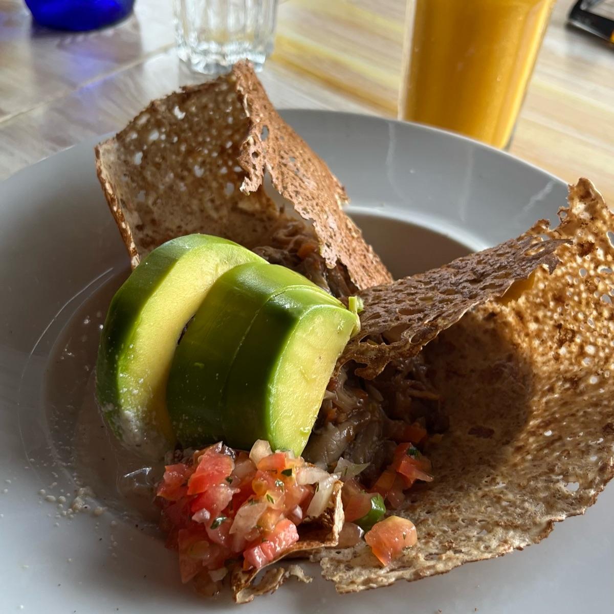 Muy rico plato, una opción típica colombiana veganizada. Trae plátano, palta, vegetales, etc. Es un plato que tarda un poco en salir pero es porque la masa la hacen en otro lado, lo cual te asegura de que sea vegana.