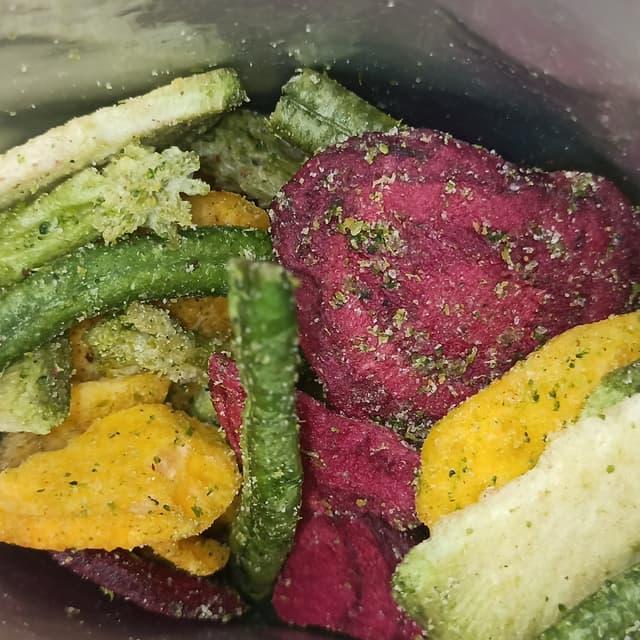Visually stunning and brilliant concept - pieces of colourful vegetable transformed into salty, savoury, crispy #chips!! We have yellow sweet potato, green radish, broccoli, green beans, beautiful beetroot, and shiitake mushrooms.