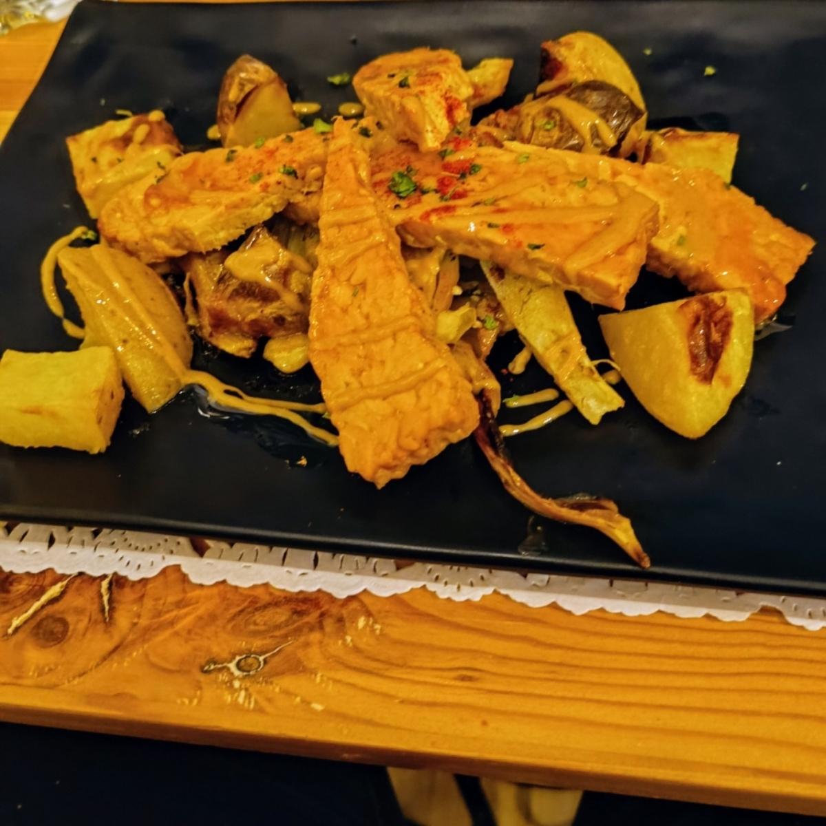 Molto buono, il tempeh all'arancia è accompagnato da finocchi e patate