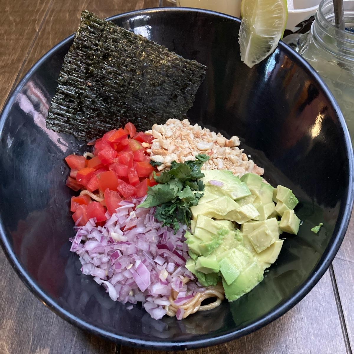 Se llama Shibuya Spicy, pero no pica nada! me encantó el sabor. El plato tenía cacahuate, aguacate, jitomate, cebolla morada y los fideos sin caldo. Me encantó!!!
