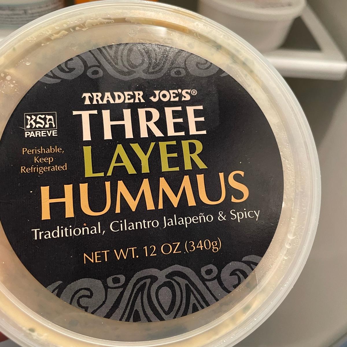 Three hummus flavors layered in a container. Smooth and creamy. All three flavors are great alone but even better combined. I paired with pita and daring Cajun chikn for a meal. Highly recommend