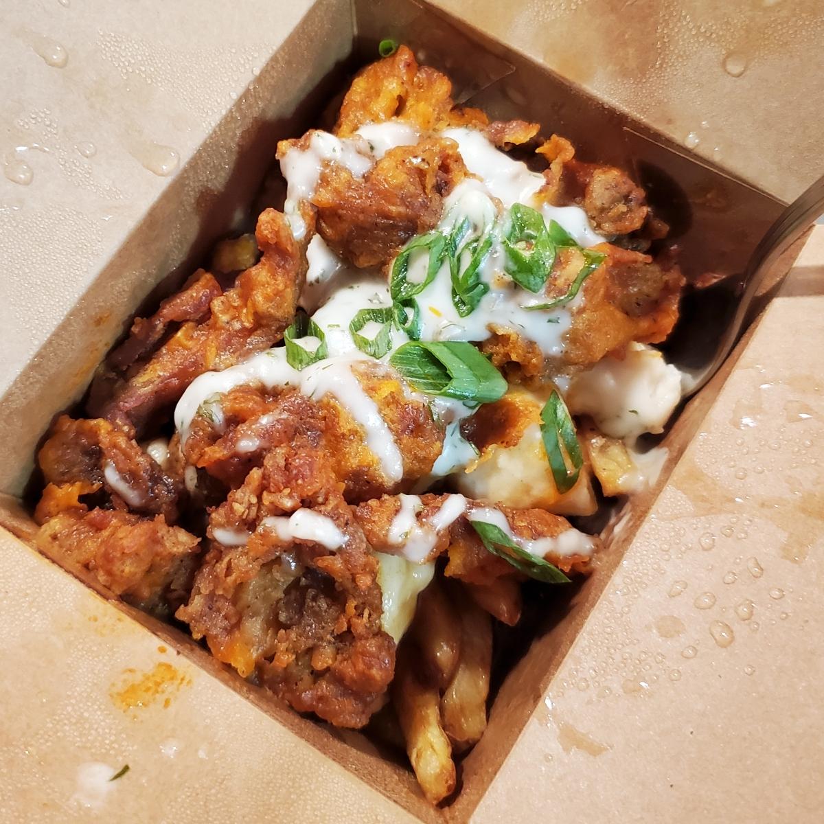 Nouvelle poutine avec leur wings de champignons buffalo, juste assez spicy, avec sauce ranch a l'ail et oignons verts 👌