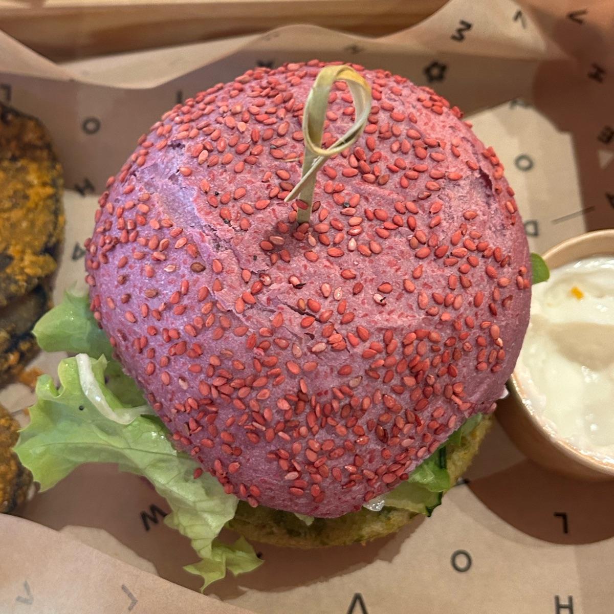 Bun lilla con burger di patate e fagiolini, hummus di piselli, mayo al basilico, cavolo bianco marinato, pomodori secchi, zucchine al forno e insalata gentilina. Buono ci è piaciuto molto! È un po’ diverso dagli altri e gli ingredienti stanno molto bene insieme.