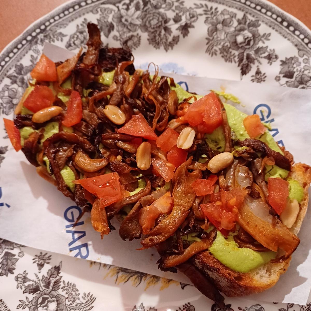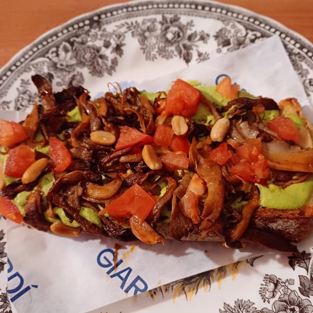 Crostone di pane con guacamole di piselli (niente male!), pomodori e funghi arrosto che ho molto gradito.