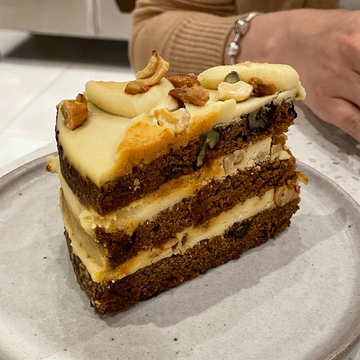 Bizcocho de coco, relleno con dulce de leche de almendras, crema de tofu, banana, praline y crocante de maní.