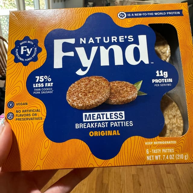 These are tasty, hearty meatless sausage patties from Fynd. They have a good meaty flavor but are a little on the firmer side. I like that they are made mainly from mushroom protein. Overall a pretty good meatless breakfast patty. #veganbreakfast