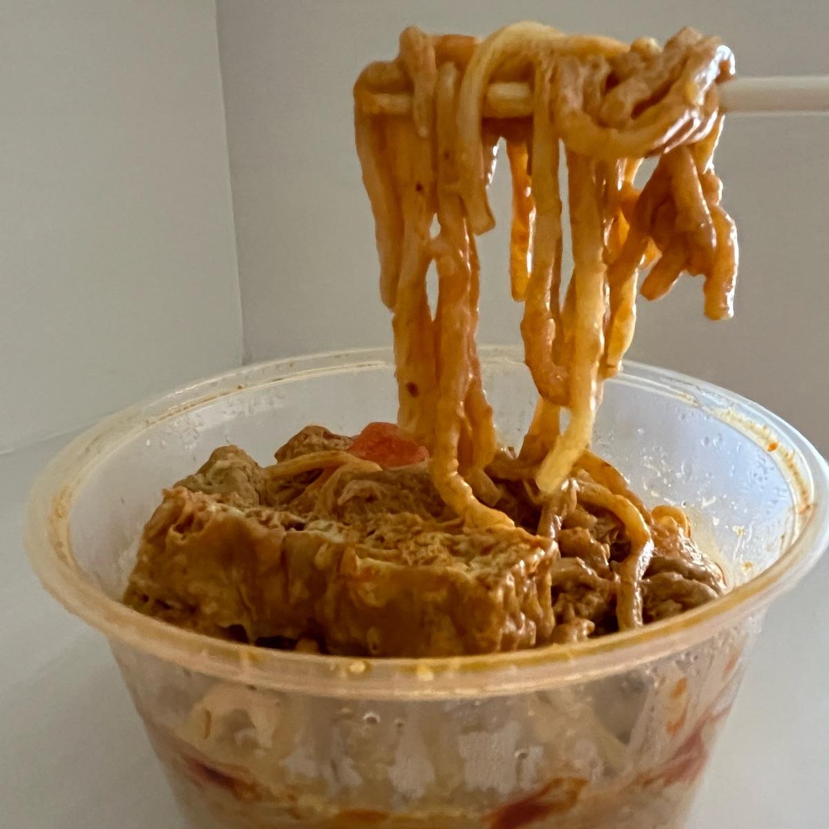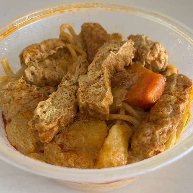 My favourite curry noodles in Singapore! Comes with chunky pieces of mock chicken, potato, carrot as well as beancurd puffs that soak up the rich & aromatic curry gravy. #singapore #curry #cheapandgood