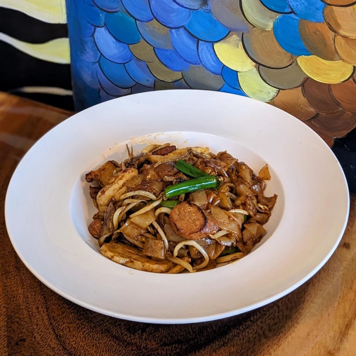 Stir-fried rice noodles with vegan #onlyeg, savoury textured soy protein Chinese sausage, konjac 'fishcake', and beansprouts. 🥢🍳 Quite spicy and tasty with wok hey! 🌶️🔥 Personally wasn't such a fan of the QQ konjac 'fishcake', but the other ingredients were good and overall this was a yummy dish with a generous amount of ingredients in every bite. One of the March 2024 Street Food specials; wallet-friendly for a restaurant~ ✨ (Contains alliums, $7.50) #sgvegan #chinesefood #noodles