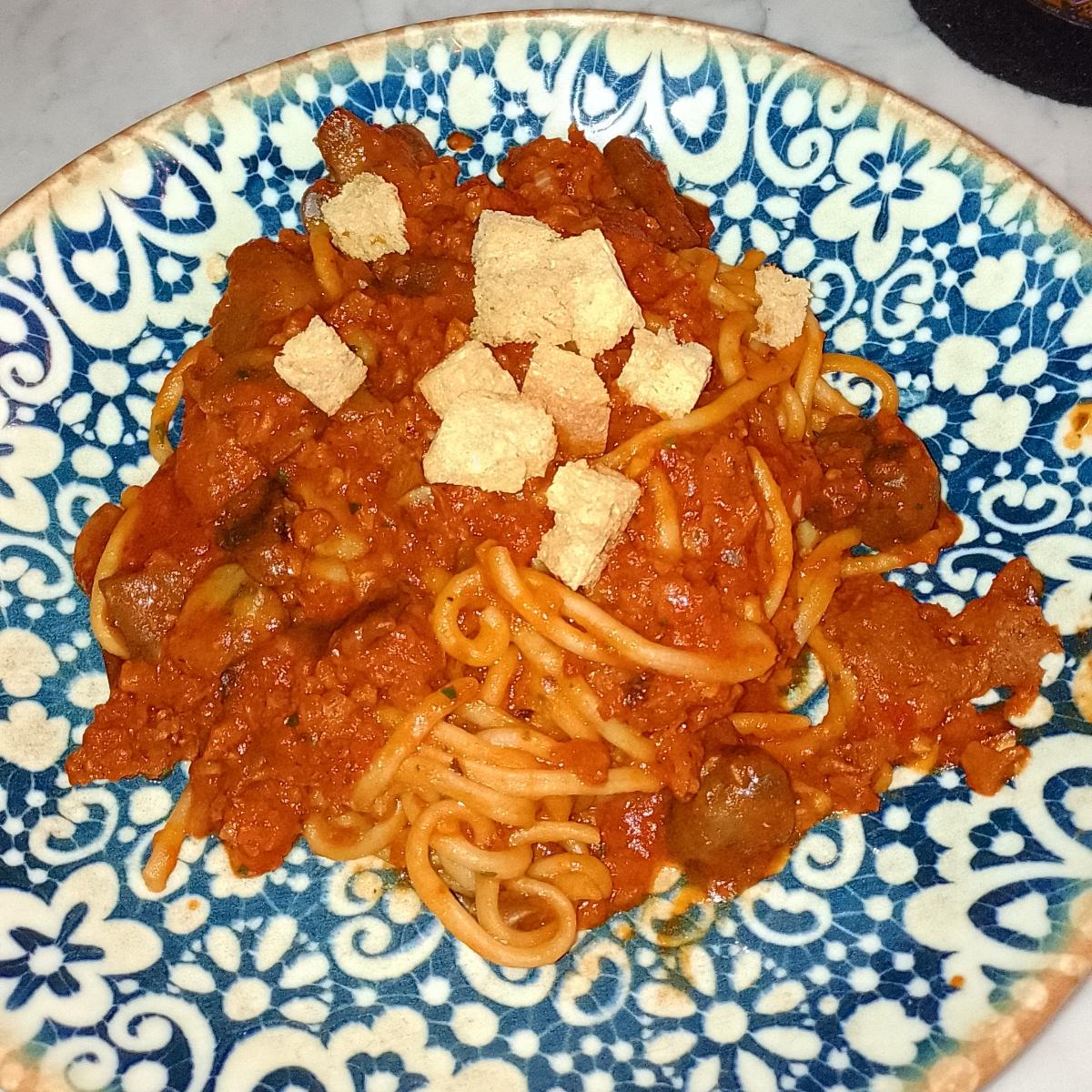 Pasta bolognesa con proteína better balance, crutones y champiñones. Considero que fue una buena porción, fue servido caliente y tiene sabor muy aceptable aunque me hubiera gustado sentir más especias. Cuesta $295.