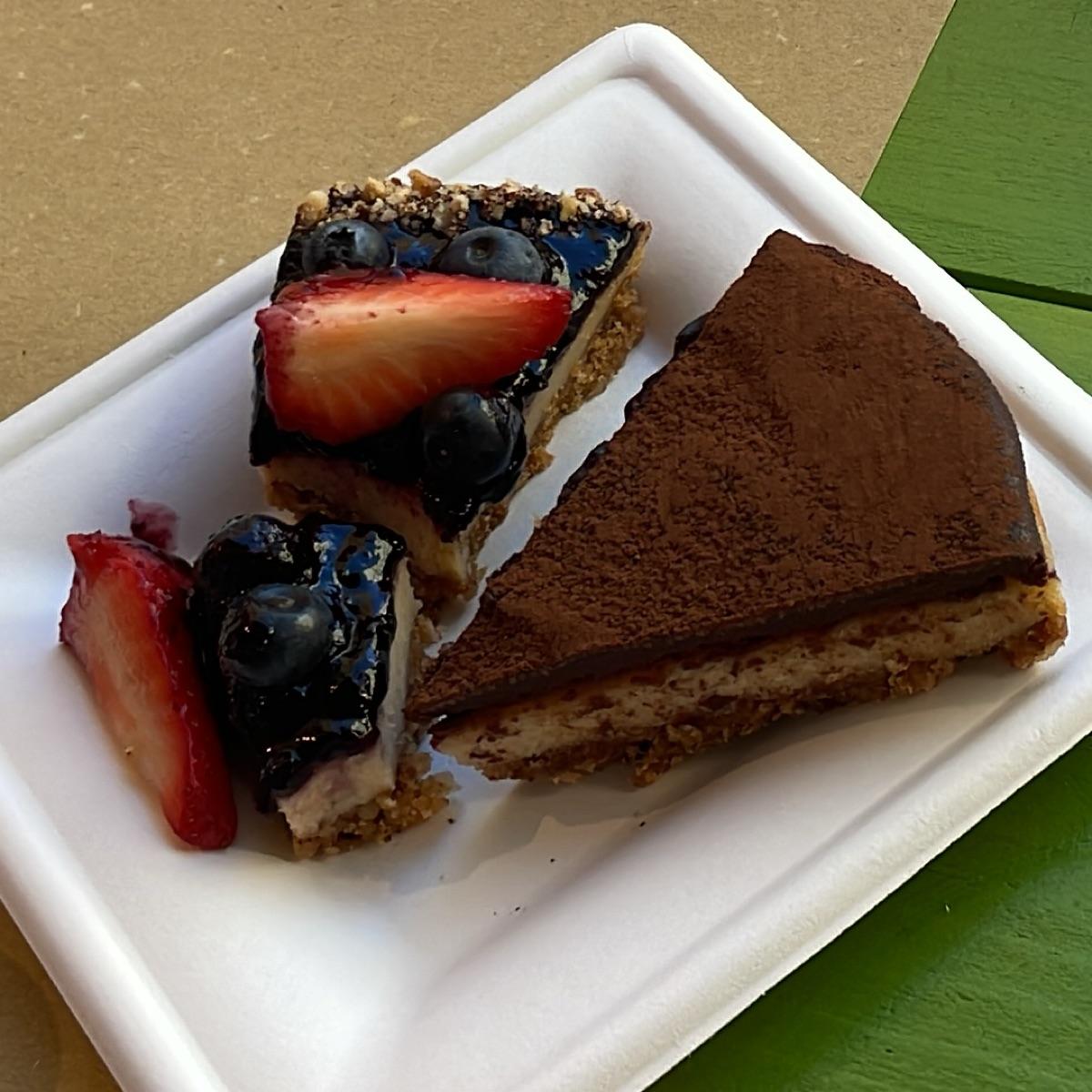 Da non perdere neanche i fantastici dolci crudisti!La cheesecake al cioccolato è ottima, come anche quella ai frutti di bosco!Se non erro sono a base di anacardi
