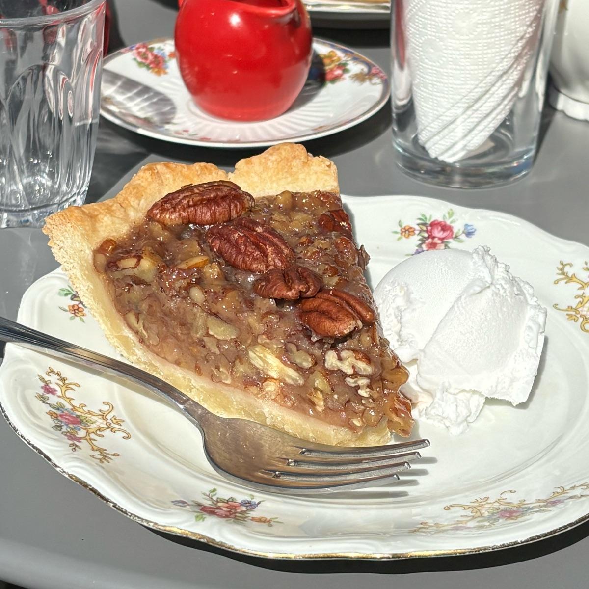 La prima volta che assaggio la pecan pie in vita mia, buonissima, poi il gelato come accompagnamento ci sta benissimo! Gustata a colazione nel bellissimo giardinetto di Snug, che con il sole di queste giornate è fantastico! Il mio posto preferito 💘