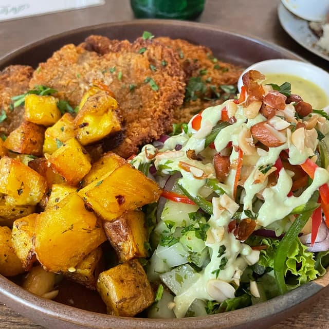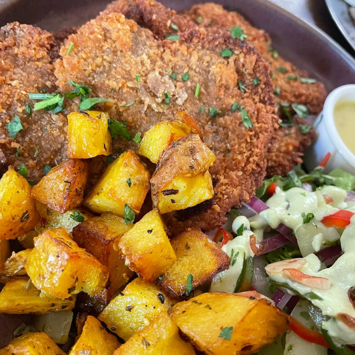 La mejor milanesa vegana que probé en Argentina, acompañada de ensalada y papas.
